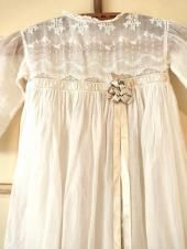 フロントドレスにリバーレースが川の流れのように、惜しげなくたっぷり使われているピュアホワイトの繊細なベビードレスです。どんな赤ちゃんが着せてもらったのでしょう? ボディの上部ネックと胸回りはとてもスモールサイズに作られています。