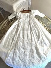 丹念に施されたフロントのホワイトワーク刺繍とピンタックの入ったギャザースカート、裾のお花のカットワーク刺繍、ビクトリアンな美しさのあるロング丈のベビードレスです。