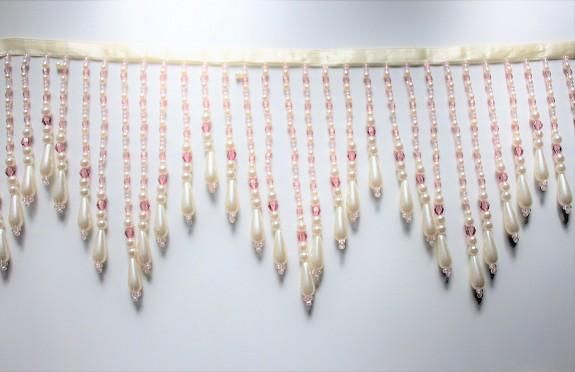 お洒落なビーズフリンジ、フレンチパールは、アイボリーホワイトの上品なパールビーズとピンクのビーズの織り成すフェミニンな印象が可愛らしいビーズフリンジです。