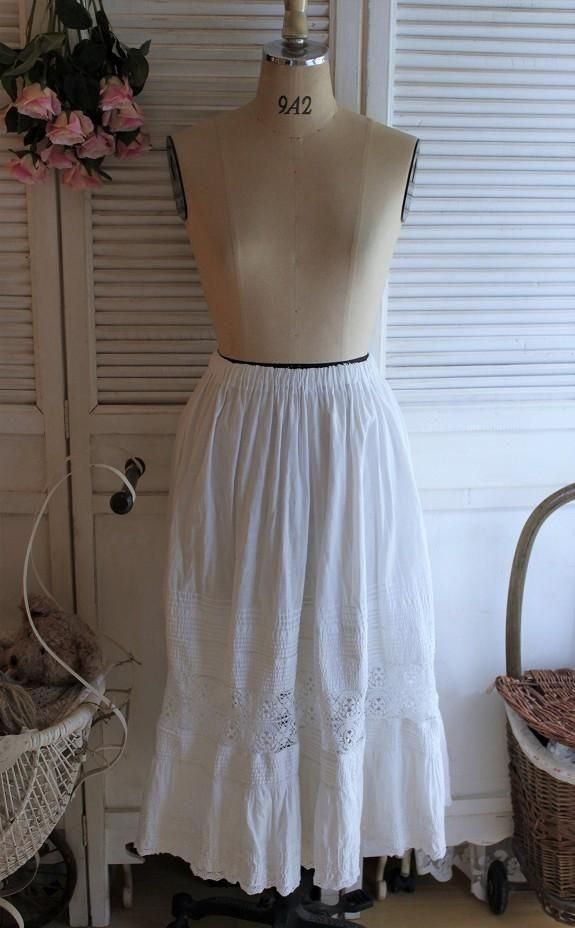 たいへん古いアンティークスカートですが、大切にお直ししながら着られてきたことが感じられます。全体的に良好なコンディションです。(お洗濯の際は、アンティークのお洋服については生地やレースの破損を防ぐため、優しくそっと押し洗い(手洗い)でされるようにしてください。)